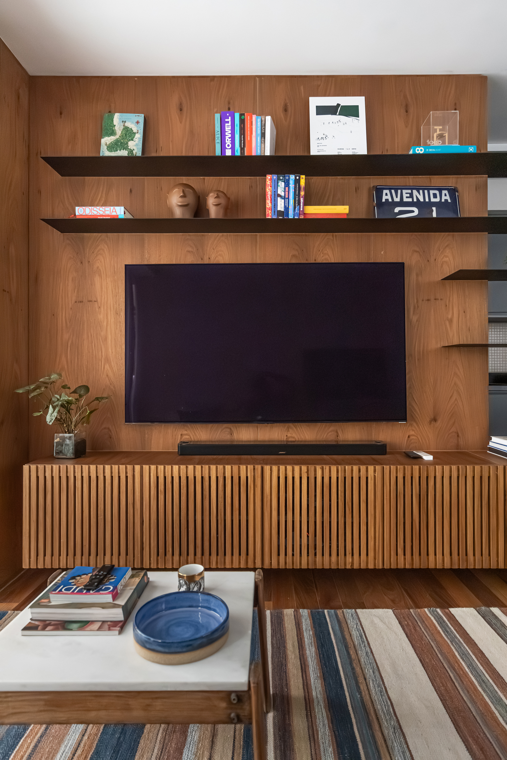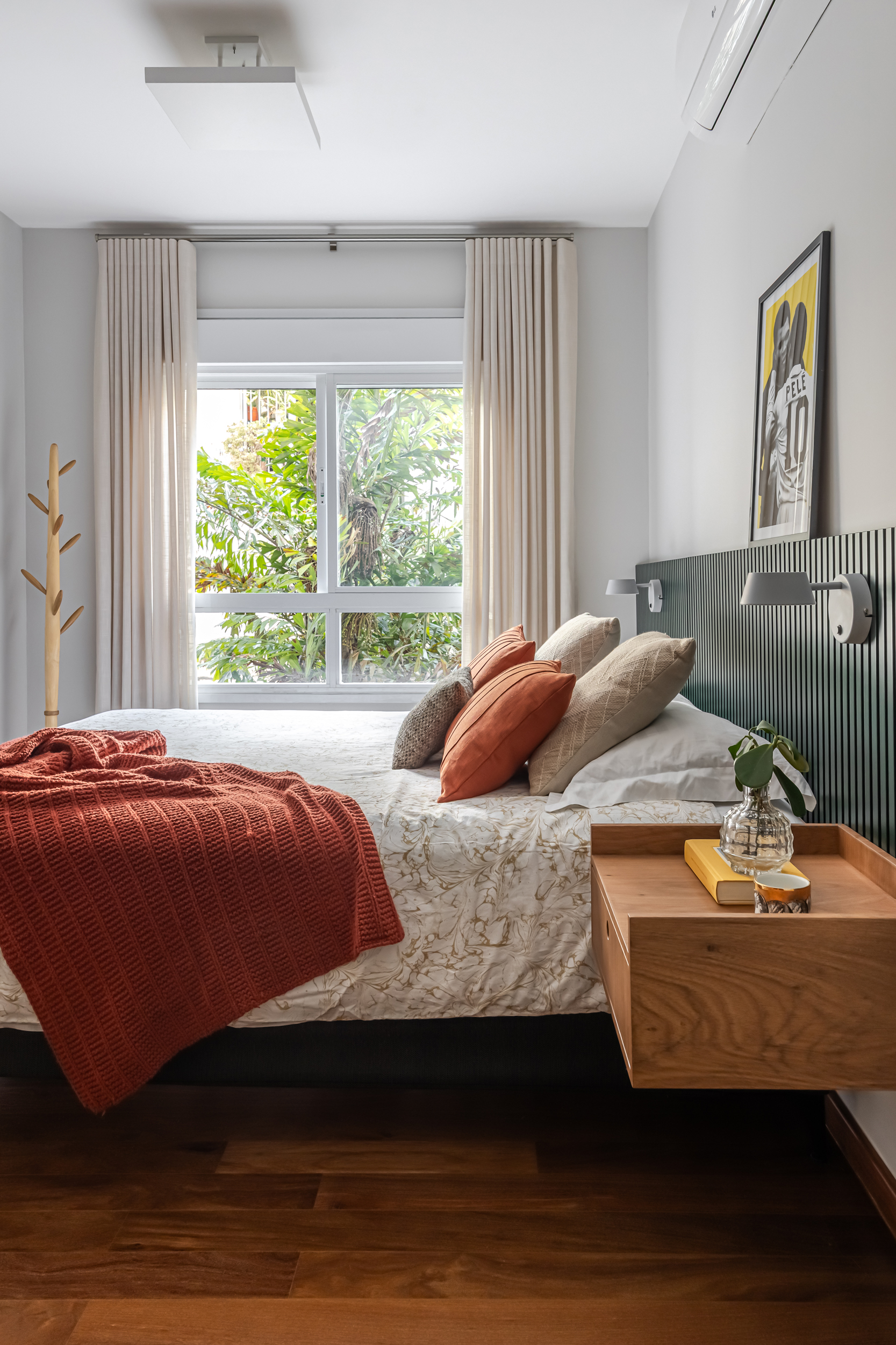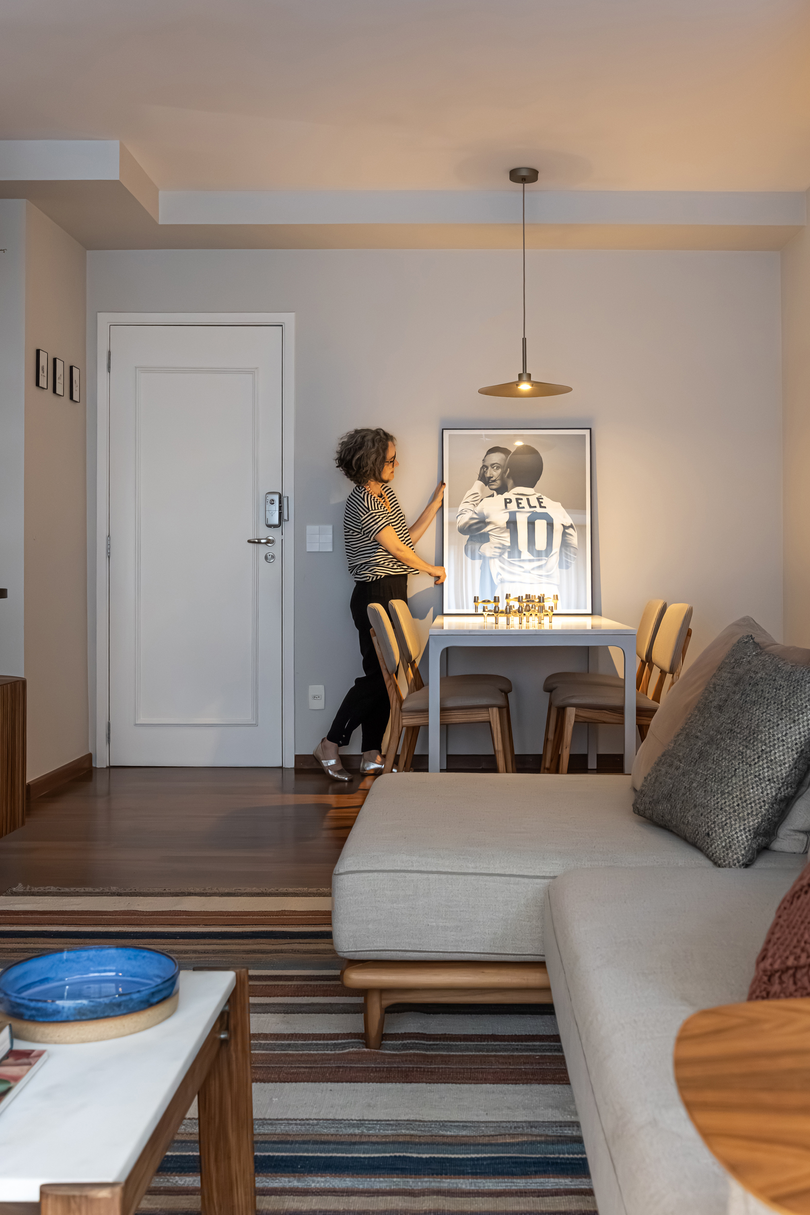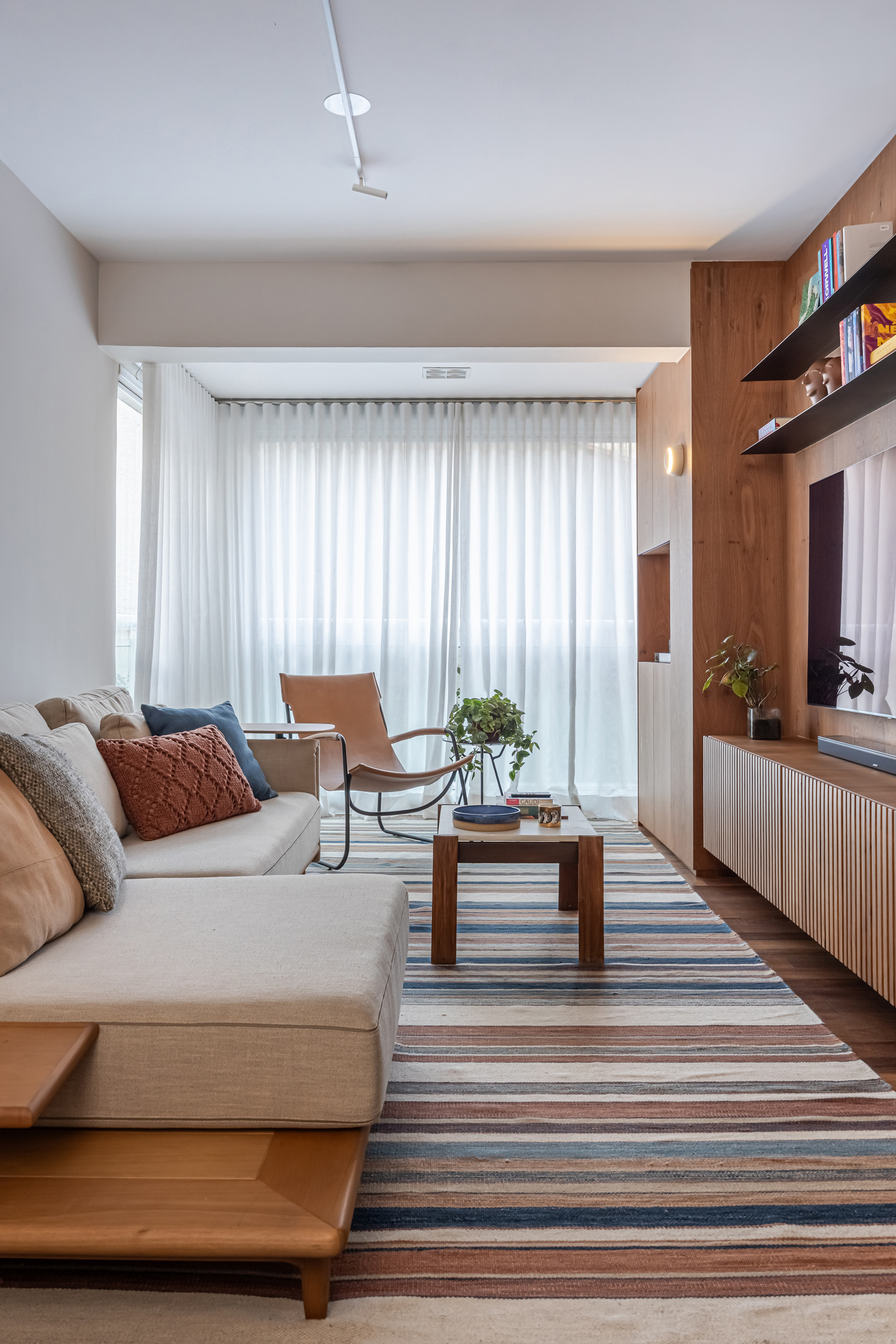 70m2 | Neste apartamento, o desafio foi criar um verdadeiro refúgio com atmosfera de casa, mesmo no coração da cidade. Localizado no alinhamento das copas das árvores, o ambiente já contava com uma base excelente, o que nos permitiu focar no que realmente faz a diferença: a alma do projeto. Sem grandes intervenções estruturais, a mágica aconteceu no desenho cuidadoso da marcenaria sob medida e em uma curadoria impecável de móveis e acessórios. Cada peça foi escolhida para refletir a personalidade do morador – um jovem executivo do mercado financeiro, dinâmico e apaixonado por futebol – garantindo funcionalidade, estilo e, claro, muito aconchego. O resultado é um lar sofisticado, prático e com aquela sensação gostosa de "chegar em casa" depois de um dia agitado, um verdadeiro oásis pessoal.