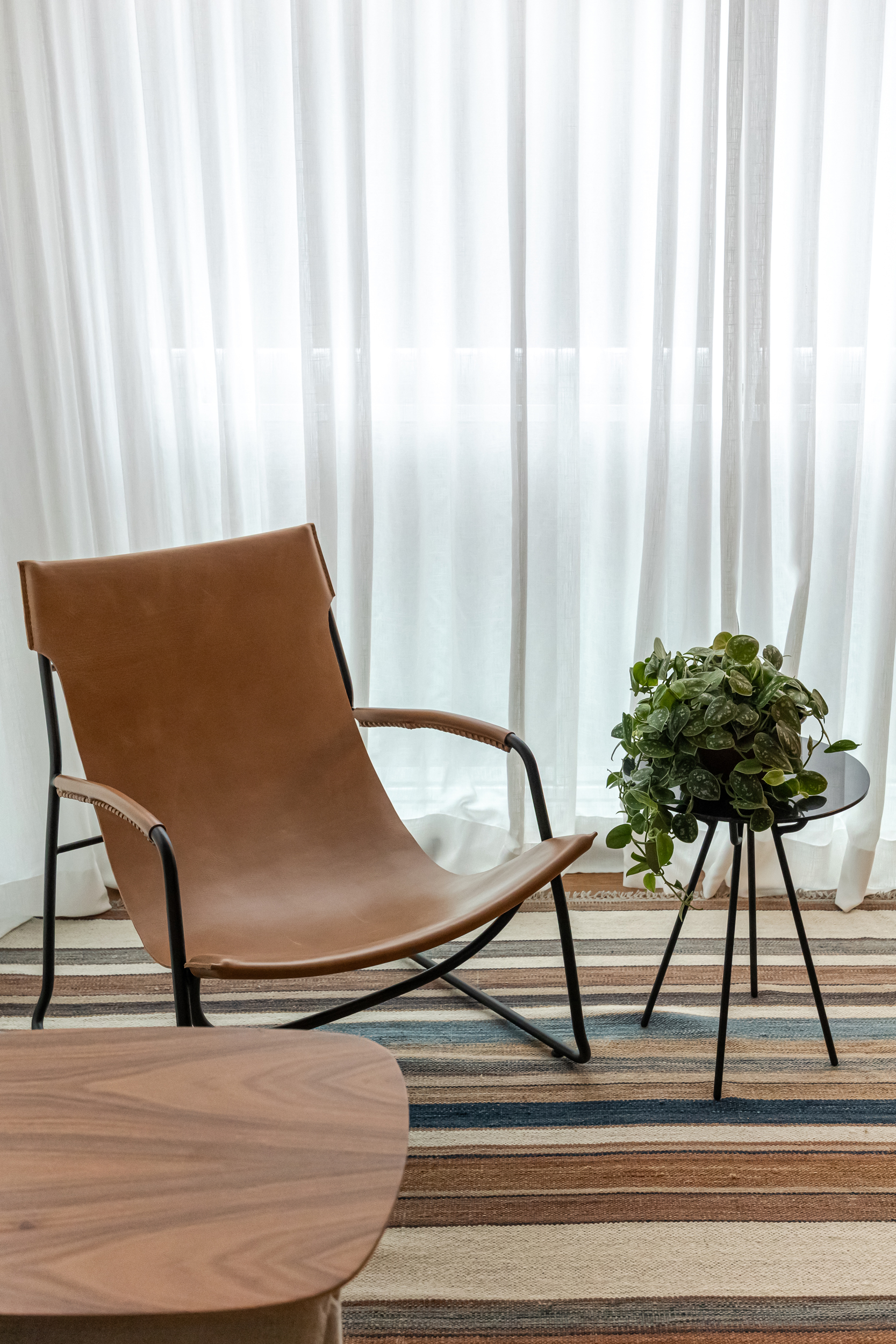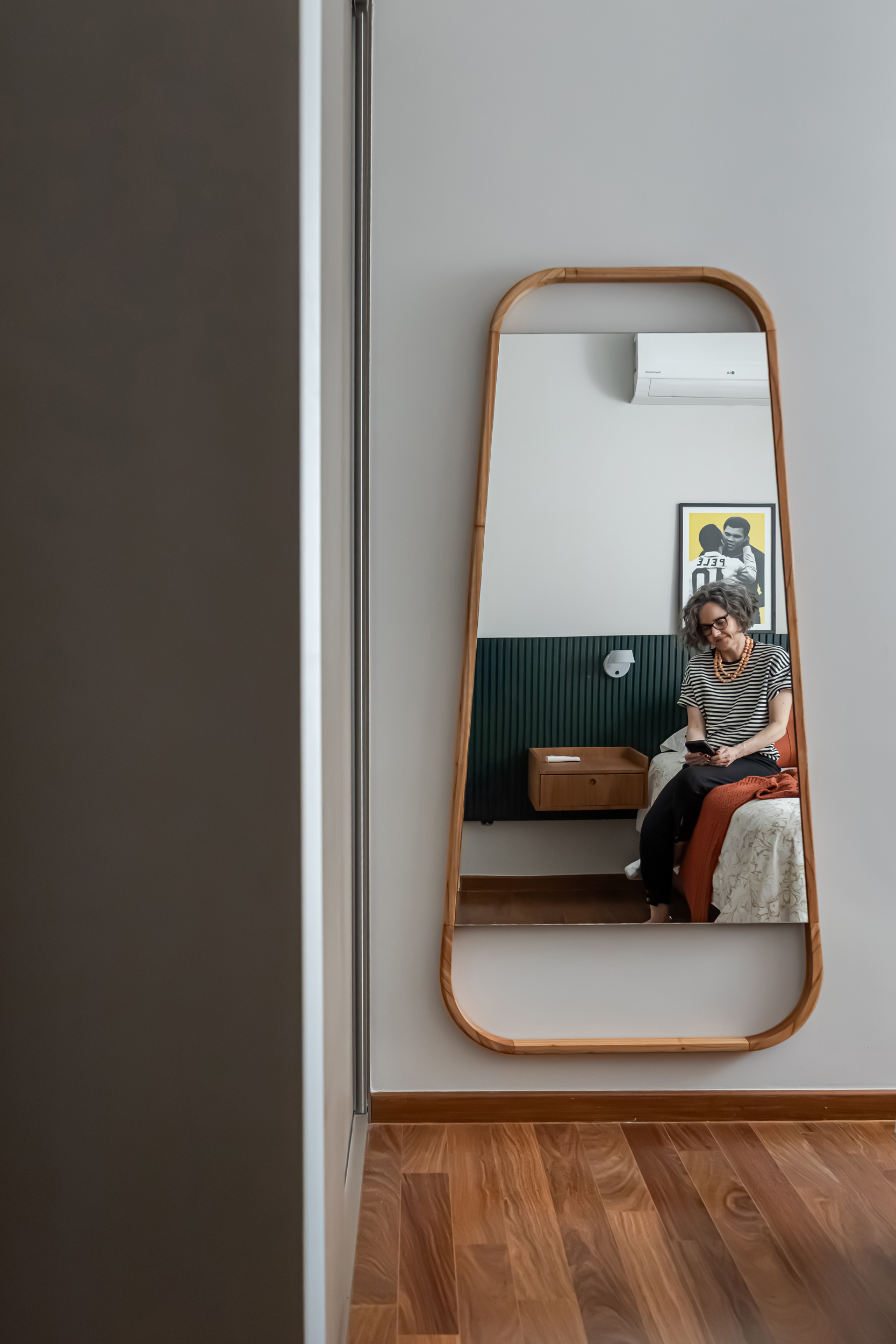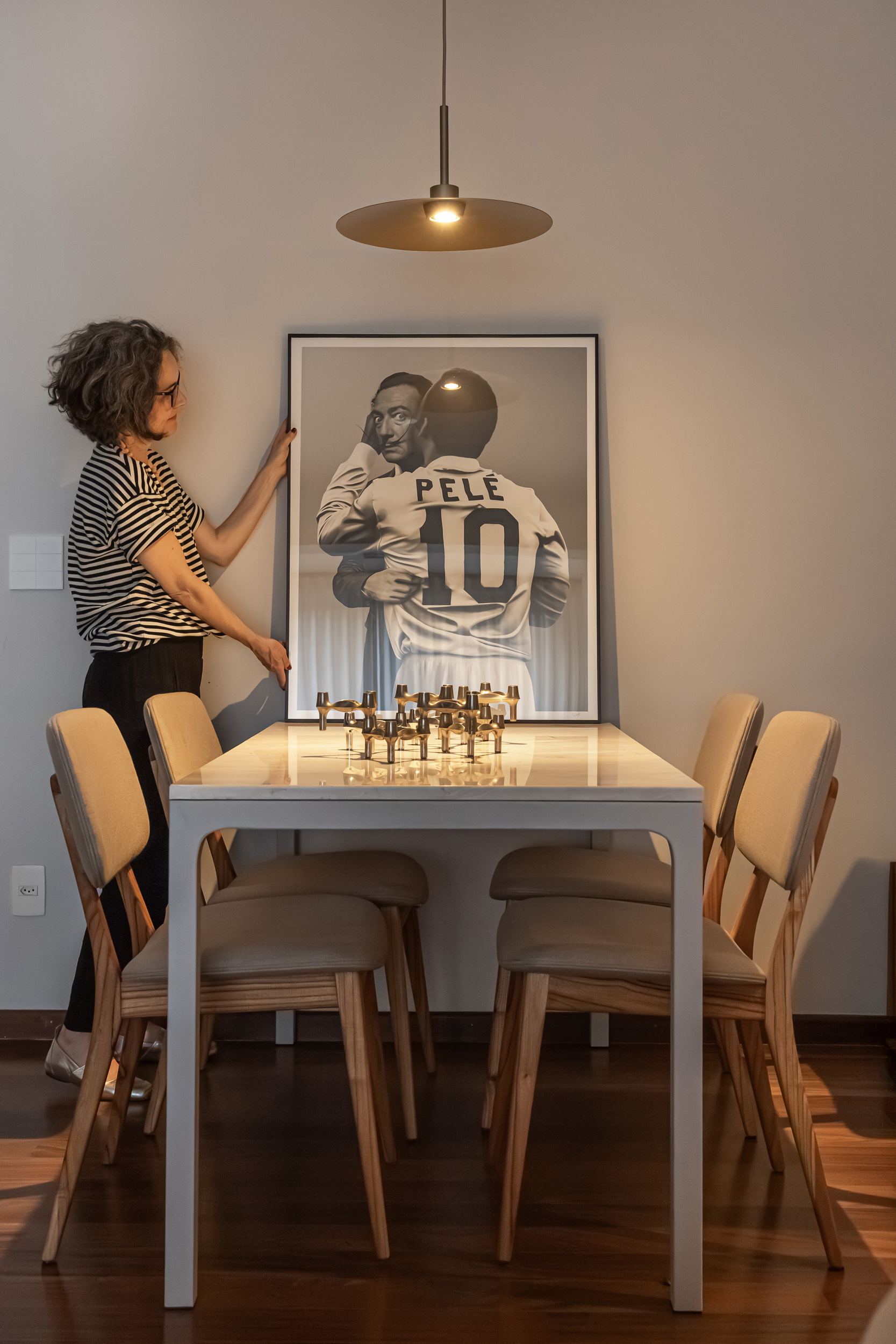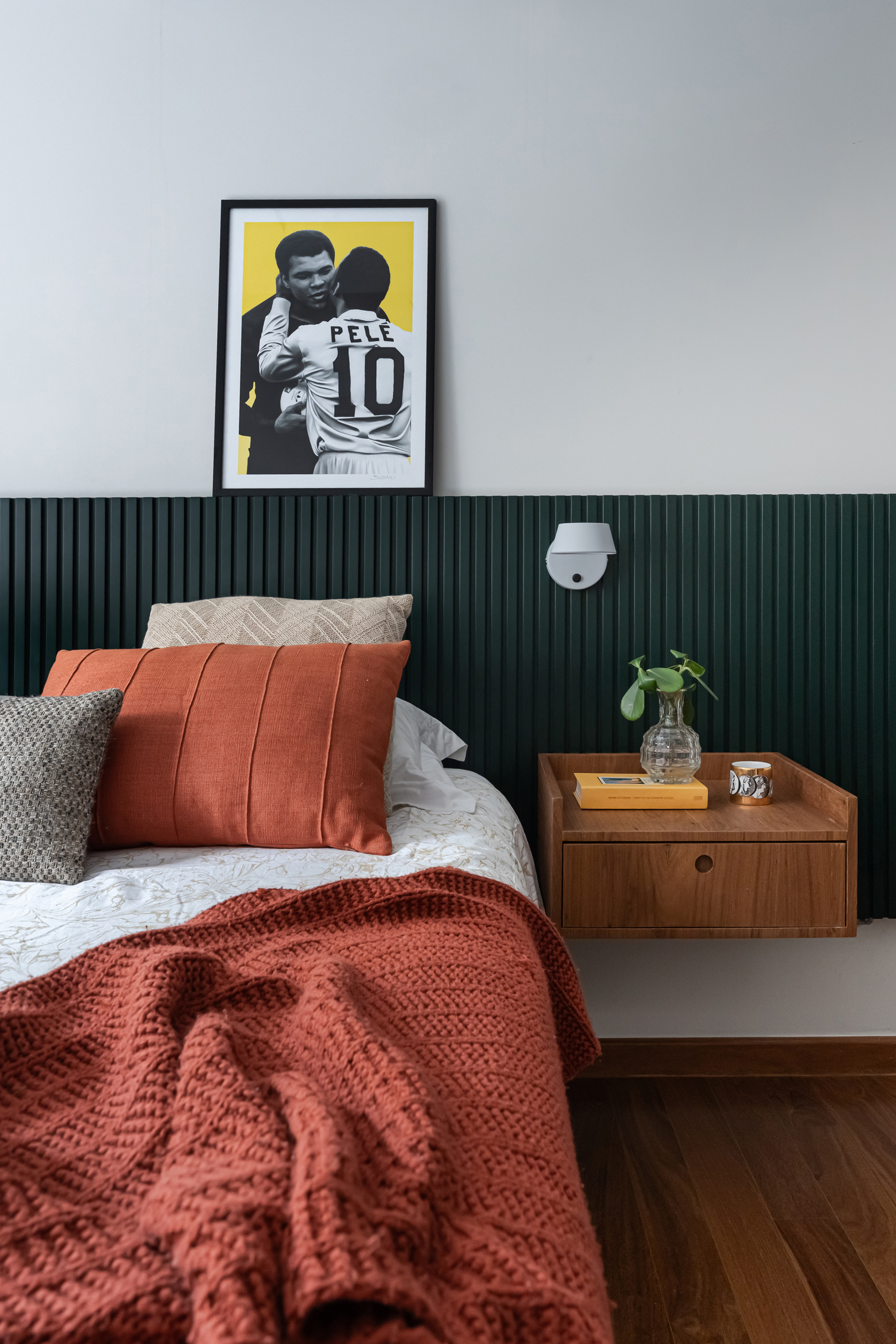 70m2 | Neste apartamento, o desafio foi criar um verdadeiro refúgio com atmosfera de casa, mesmo no coração da cidade. Localizado no alinhamento das copas das árvores, o ambiente já contava com uma base excelente, o que nos permitiu focar no que realmente faz a diferença: a alma do projeto. Sem grandes intervenções estruturais, a mágica aconteceu no desenho cuidadoso da marcenaria sob medida e em uma curadoria impecável de móveis e acessórios. Cada peça foi escolhida para refletir a personalidade do morador – um jovem executivo do mercado financeiro, dinâmico e apaixonado por futebol – garantindo funcionalidade, estilo e, claro, muito aconchego. O resultado é um lar sofisticado, prático e com aquela sensação gostosa de "chegar em casa" depois de um dia agitado, um verdadeiro oásis pessoal.